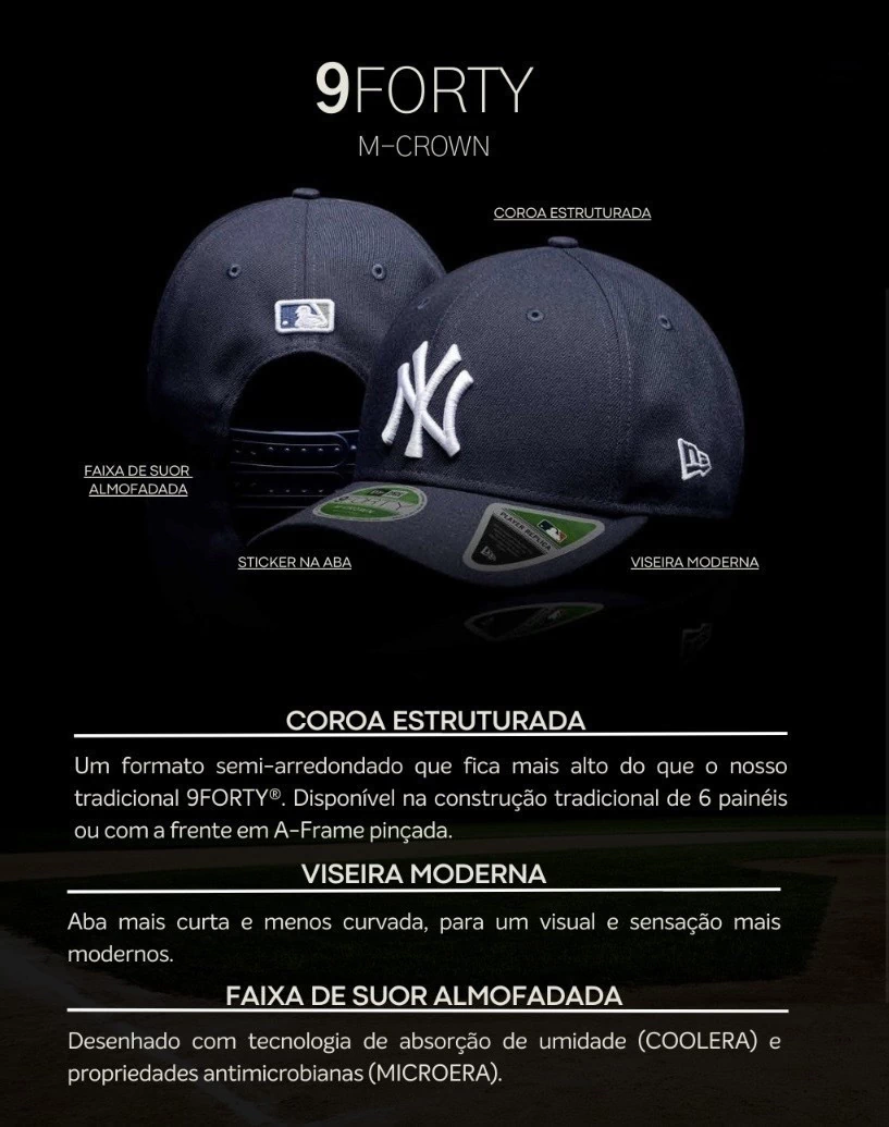 Conforto e Ajuste Perfeito: Com uma copa estruturada e um fechamento tipo Snapback, o Boné 9FORTY M-Crown é ajustável e proporciona um encaixe confortável e seguro. A aba curva e a contra-aba em cor contrastante garantem um visual moderno e descolado.